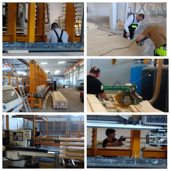 Strādniekus kokapstrādes cehā (garumā audzēts materiāls, CLT paneļi u.c.)